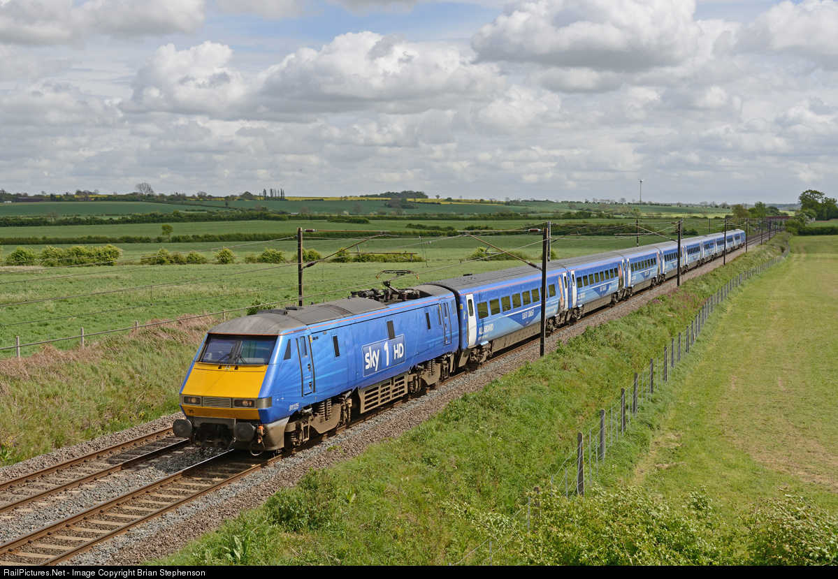 | The 13.00 Kings Cross (London) to Edinburgh heads north from Grantham near Hougham formed of an East Coast Trains set with a Sky 1 HD vinyl wrap. |