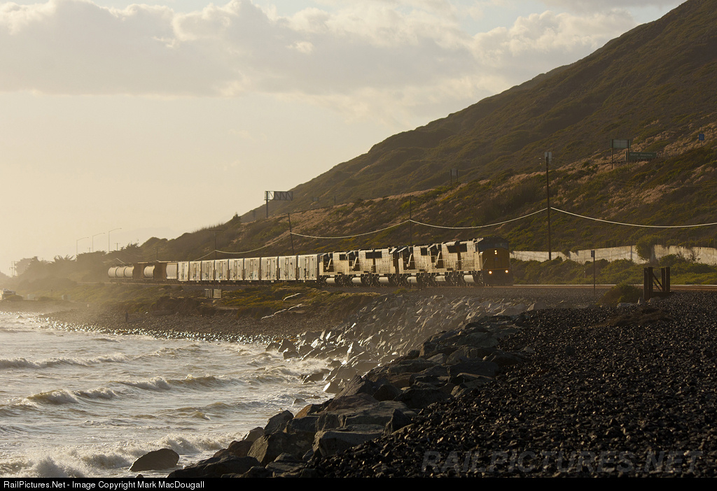 The inbound Guadalupe Hauler hugs the Pacific Coast at sunset behind six SD60 variants.
