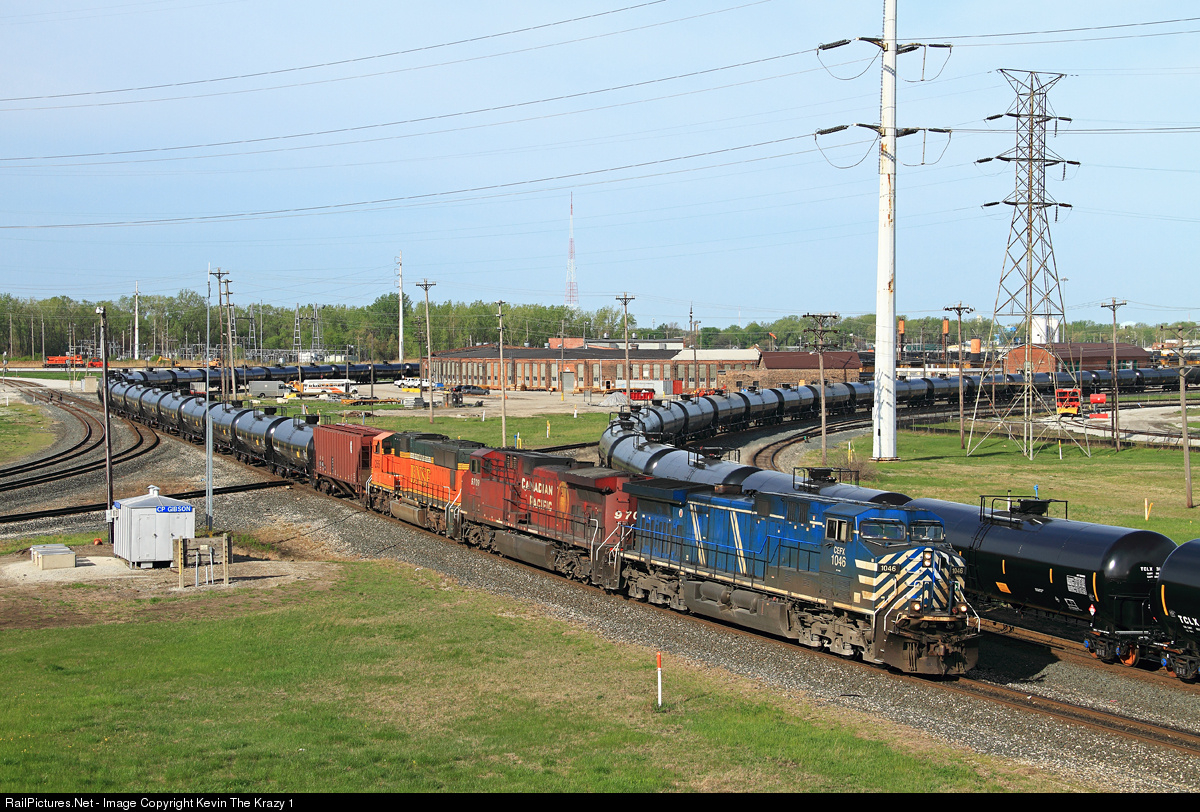| The oil business is booming and railroads are scrambling for power. At the east end of IHB's Gibson Yard, CP oil loads for the NS roll past the roundhouse with a rather colorful consist. |
