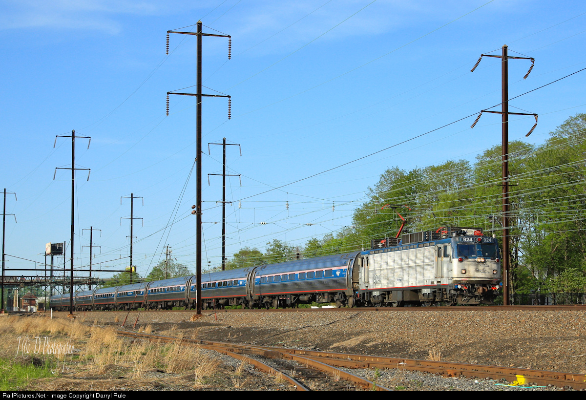 | Train 159 has run with an ACS-64 for power for months now, so I took my dad over to get his first look at one after Mother's Day dinner. Sun was perfect for the first time in 3 weekends. So what does Amtrak do? Instead of a shiny new ACS-64, they assign what could quite possibly be the worst looking motor on their current roster, AEM-7 924. Awesome! |