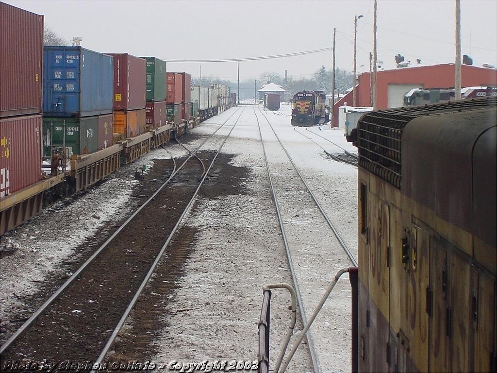 The view from WC 1562 as Q11991-30 heads northbound out of Stevens Point past the depot.