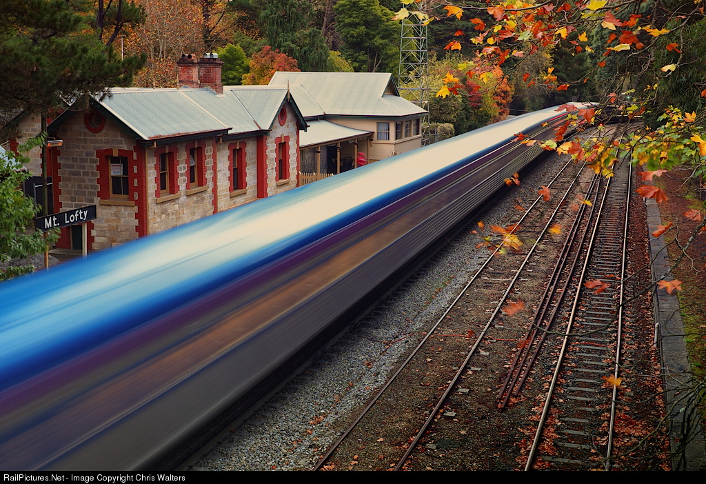 The Westbound 'Overland' from Adelaide to Melbourne slips through peaceful Mount Lofty Station, in the Adelaide Hills near Stirling, at dusk on an autumn evening. The station is no longer served by passenger trains, but is now advertised as boutique accommodation. The photographer spent the next three nights staying here.