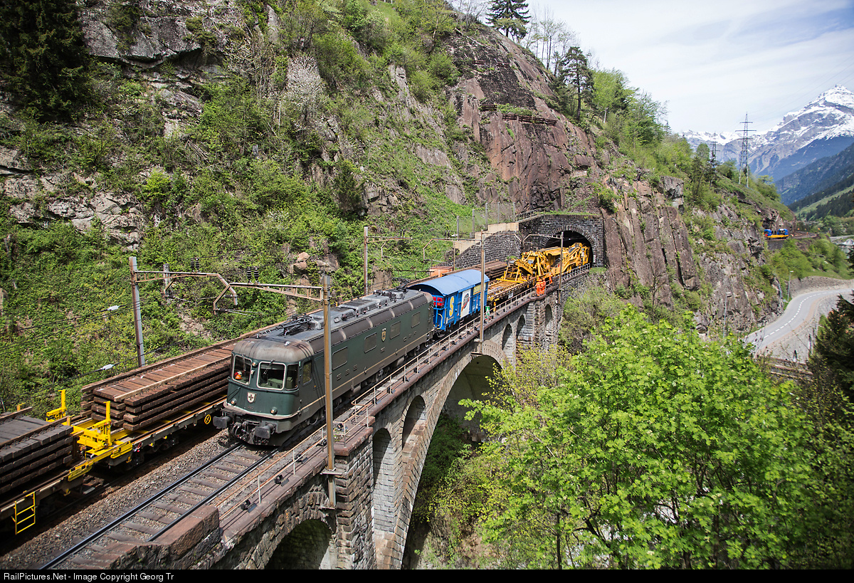 | One of only two left Re 6/6 in green paint scheme and round lower headlights, # 11663 "Eglisau", is pulling train 69836 from Limmattal shunting yard (RBL) to Ambri with a long track renewal train of Scheuchzer company over the lower Meienreuss bridge near Wassen. On the other track, another renewal machinery of Scheuchzer is working to remove the sleepers. |