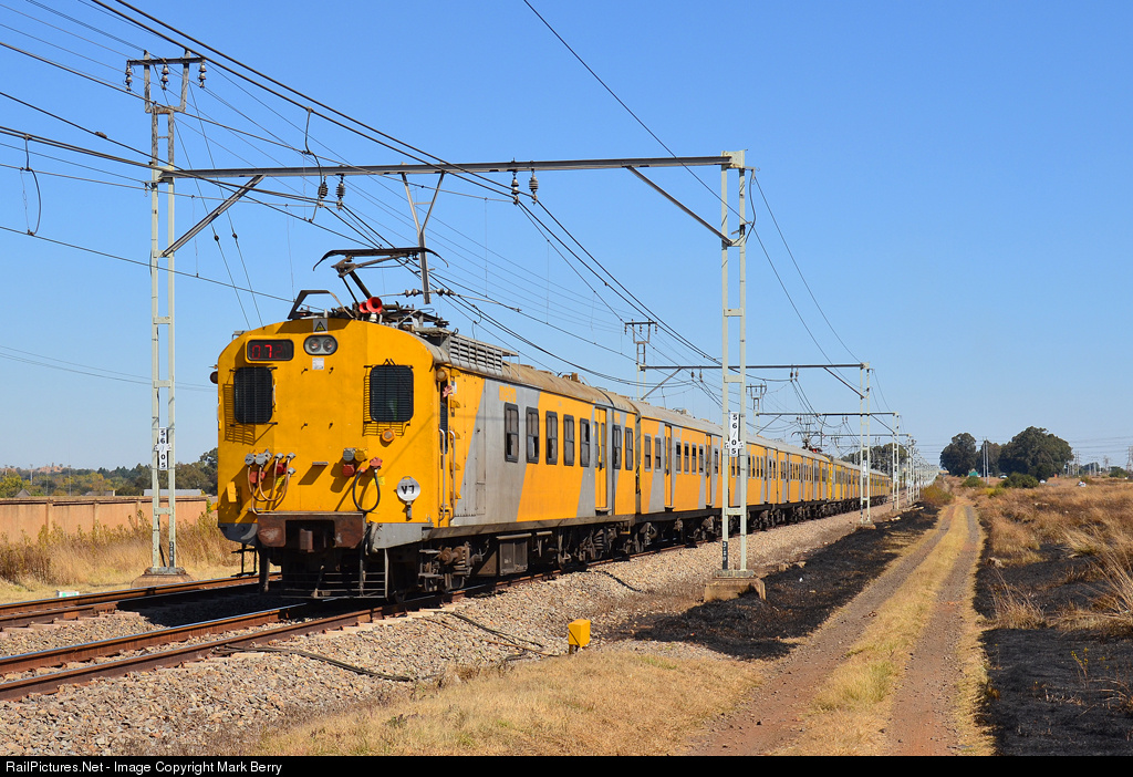 | A Metrorail service from Vereeniging to Johannesburg is approaching Redan on an autumn afternoon. The yellow and grey Metrorail livery helps to counter the patches of burnt grass along the right of way, which are quite common at this time of year as the dry winter season approaches. |