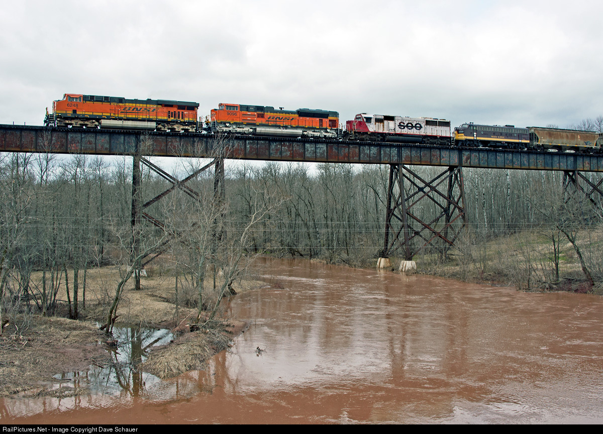 | Under an overcast sky BNSF's Superior to Northtown manifest crosses over a rain swollen Nemadji River. Along for the ride was Soo Line FP7A 2500A headed for the streamliner event in Spencer. By pure chance a leased former Soo Line SD60 (CEFX 6002) was part of the consist and coupled to 2500. What are the odds of that! |