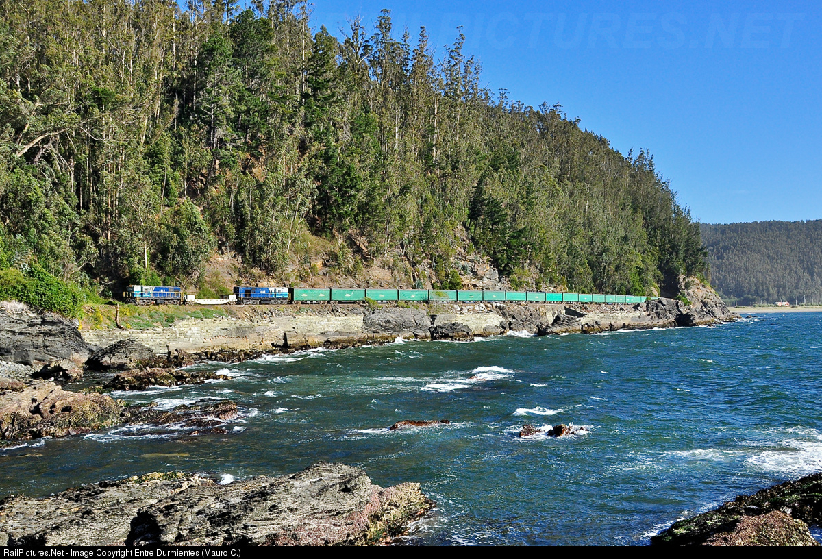 Northbound FEPASA train #50.554 load of cellulose and empty chemical tanks, crosses 12 tunnels on a beautiful coastal stretch and difficult to access, there is no possibility to reach by car, just walking down the railroad for several miles, and trying to achieve some location without risking to fall into the rocks. This area is known as "Colcura", the train after crossing tunnel No. 10, bordering the pacific ocean.