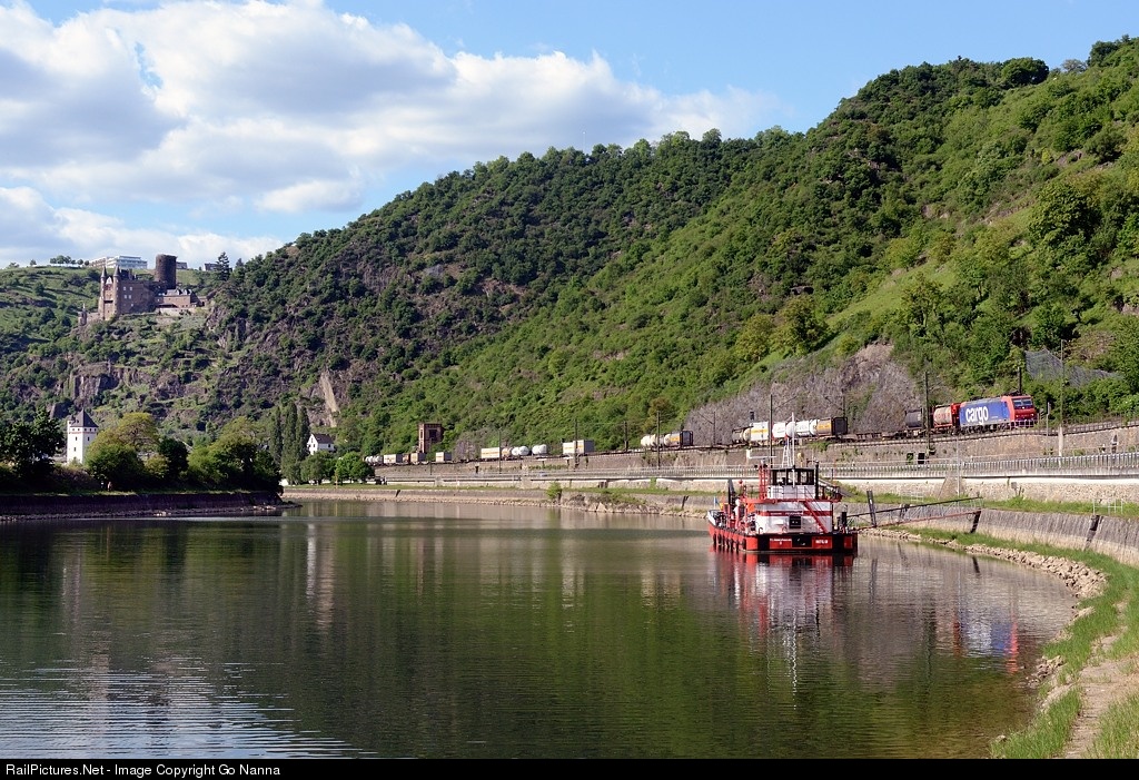 Southbound intermodal negotiates a big curve just below the famous Loreley rock along the Rhine river valley.