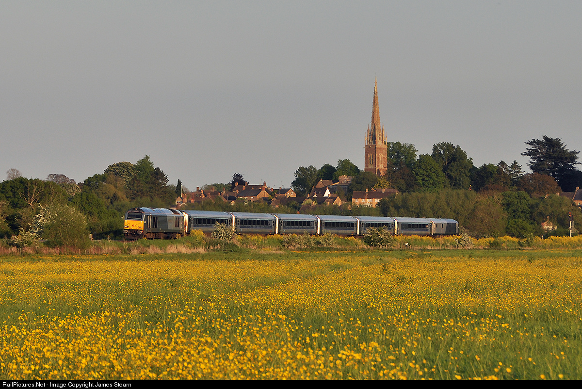 | 67012 'A Shropshire Lad' passes a meadow of spring flowers as it hauls the 18:47 Marylebone-Kidderminster through Kings Sutton on a glorious early summer evening. |