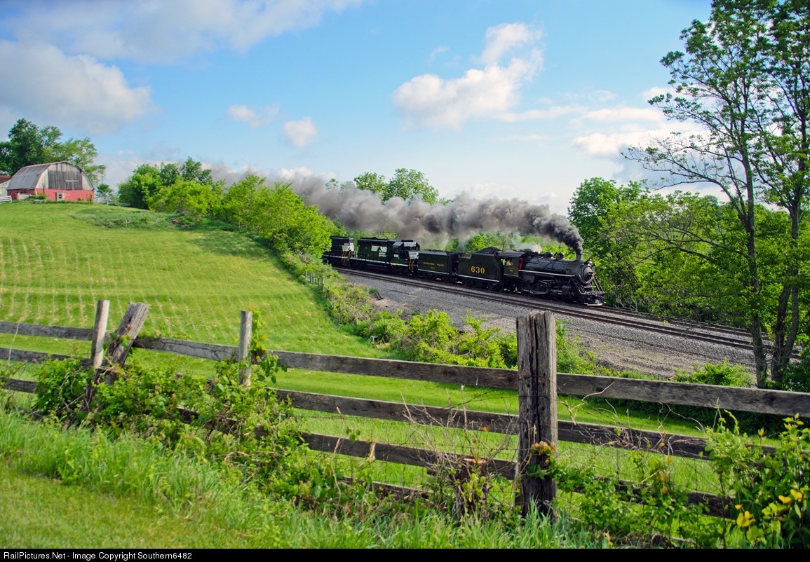 | On a cool, crisp Saturday morning in May, Southern 630 looks right at home leading a train down the CNO&TP at the scenic Blanchett, KY. |