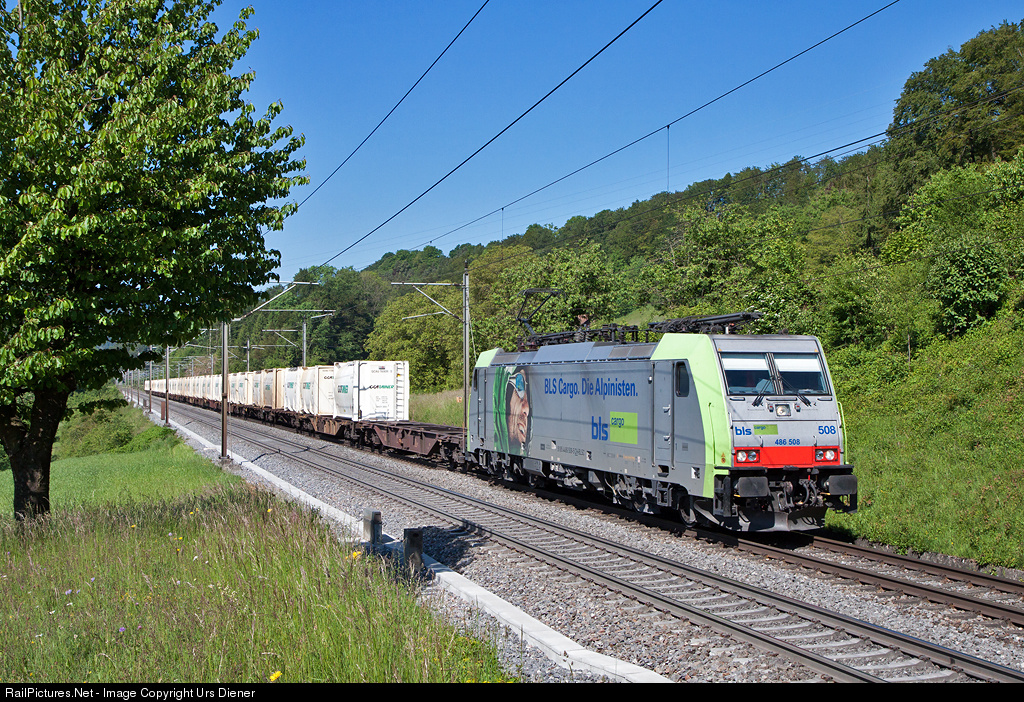 | BLS multi system locomotive 486 508, built 2009 by Bombardier, with an intermodal train on the Bözberg south ramp. |