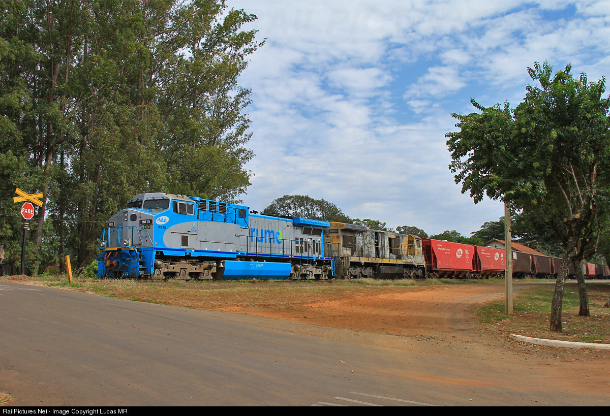 | Southbound loaded train X76 standing by at Bueno de Andrada (ZDZ) yard, headed by Rumo AC44i #9815. The locomotive was recently washed and the second unit is an ex-ATSF C30-7. |