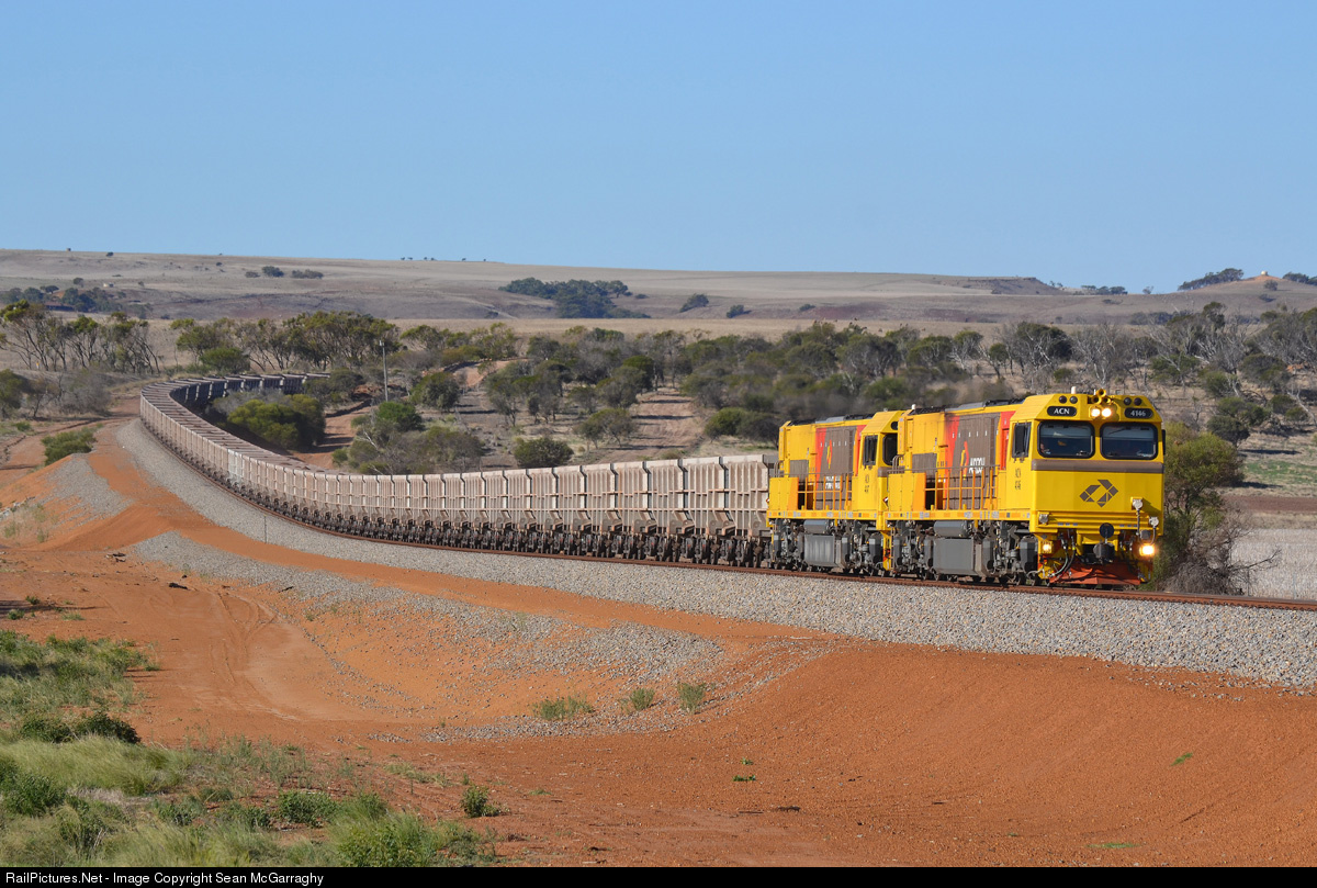 | With Karara Mining Ltd's iron ore contract with Aurizon now in full swing, ACN4146 & ACN4147 are shown here leading 5763 loaded KML ore train from Karara with ACN4142 at the rear of the train in DPU configuration. The train is climbing Micko's Dip less than 30km from its destination at Geraldton port. |