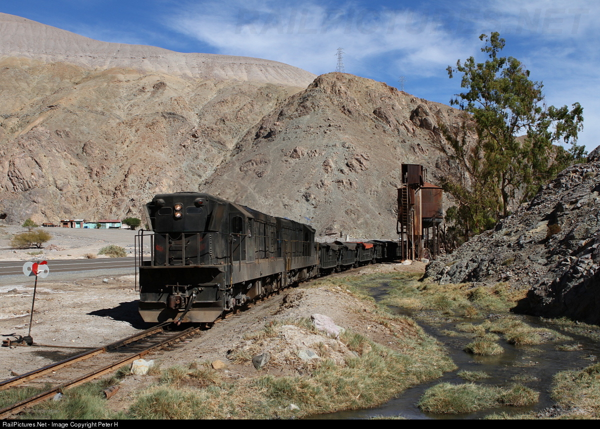 | The Encanche station is still used as passing place, but only for diesel trains. So the remnants of the steam era are no longer used, but still there. Even if we are here in one of the earth's driest place if there is some water some weak green shoot out through the sand and rock. Codelco owned and Ferronor leased GR12U #93 and a sister are hauling a copper ore train up to the Potrerillos smelter. |