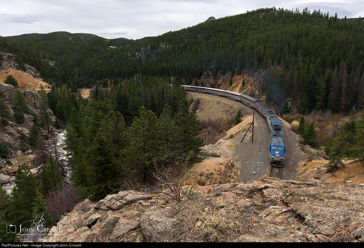 | Amtrak #5, The California Zephyr, rounds the horseshoe just east of Pinecliffe, Colorado. The train is about to enter the short bore of Tunnel #29. |