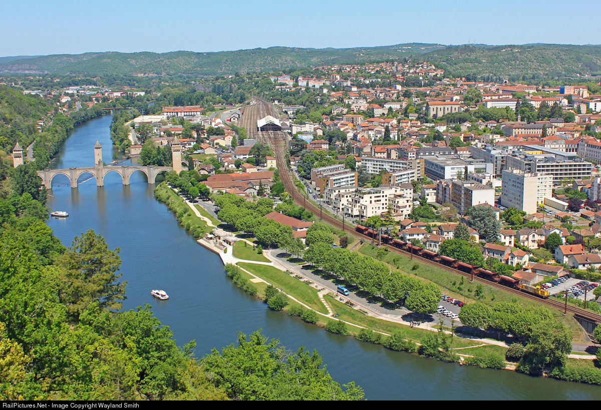 An short freight leaving Cahors within sight of the famous 14th century fortified bridge.