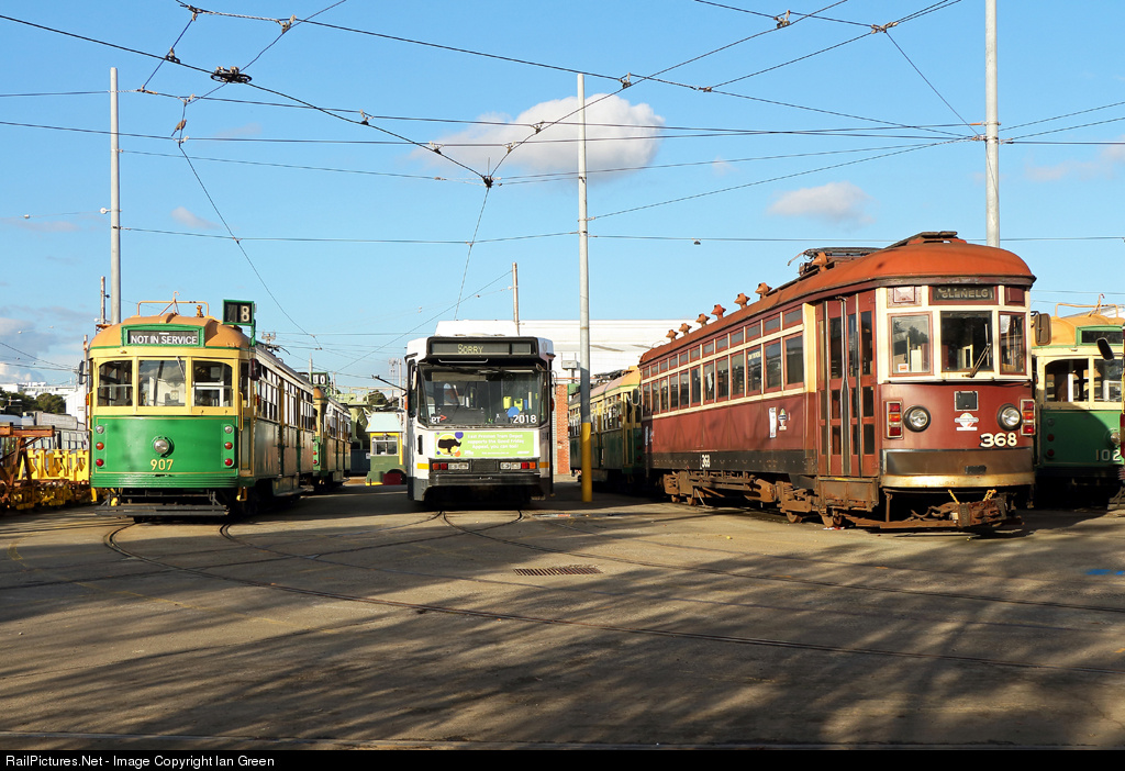 Preserved ex Trans Adelaide H class tram No.368 shares the Preston Workshops with Yarra Trams B 2018 and W 907.