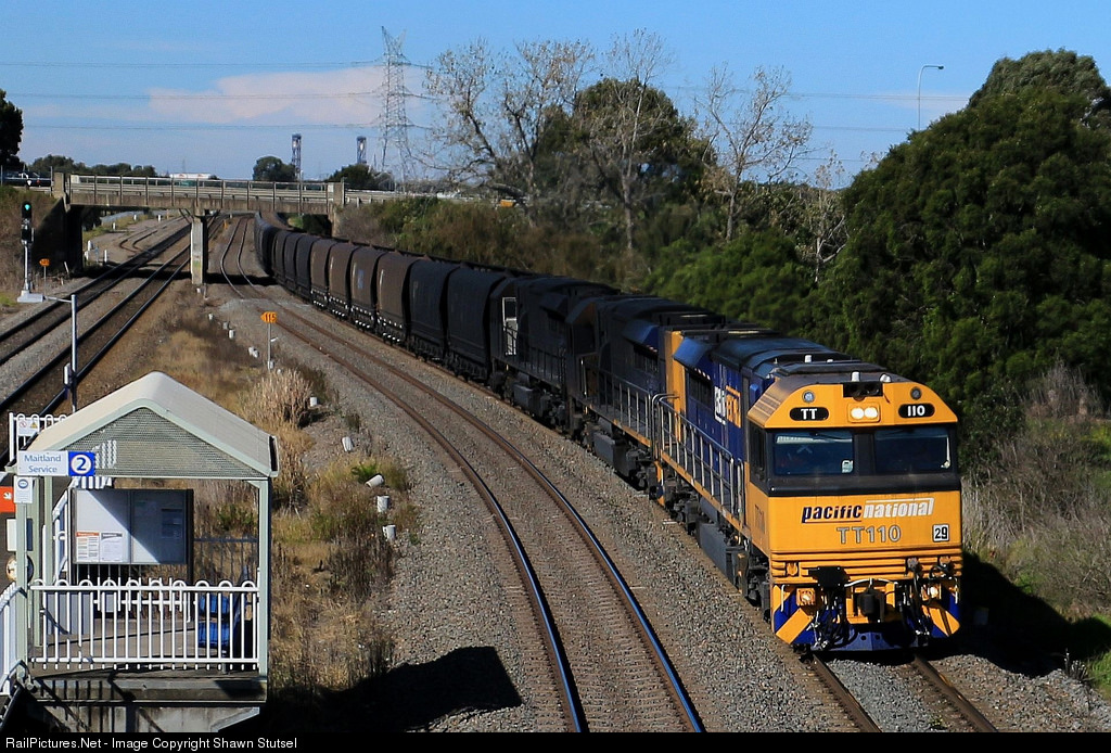 | Pacific National's TT110 leads two of the filthiest TT's I have ever seen, through Tarro, Newcastle with an Empty Coal Service... |