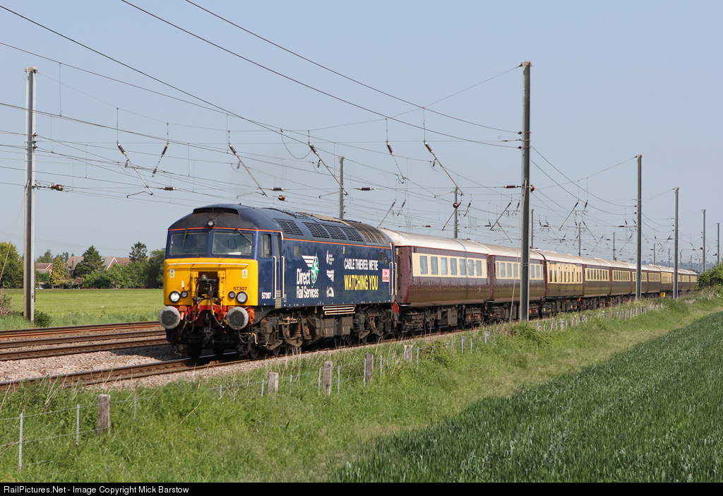 | Wearing a special colour sheme promoting anti cable theft on behalf of The British Transport Police and also Newtwork Rail. Class 57, number 57307 is seen on 1Z33, 0637 York to Windsor & Eton Riverside charter at Langford at 10:35 on 17/5/2014. |