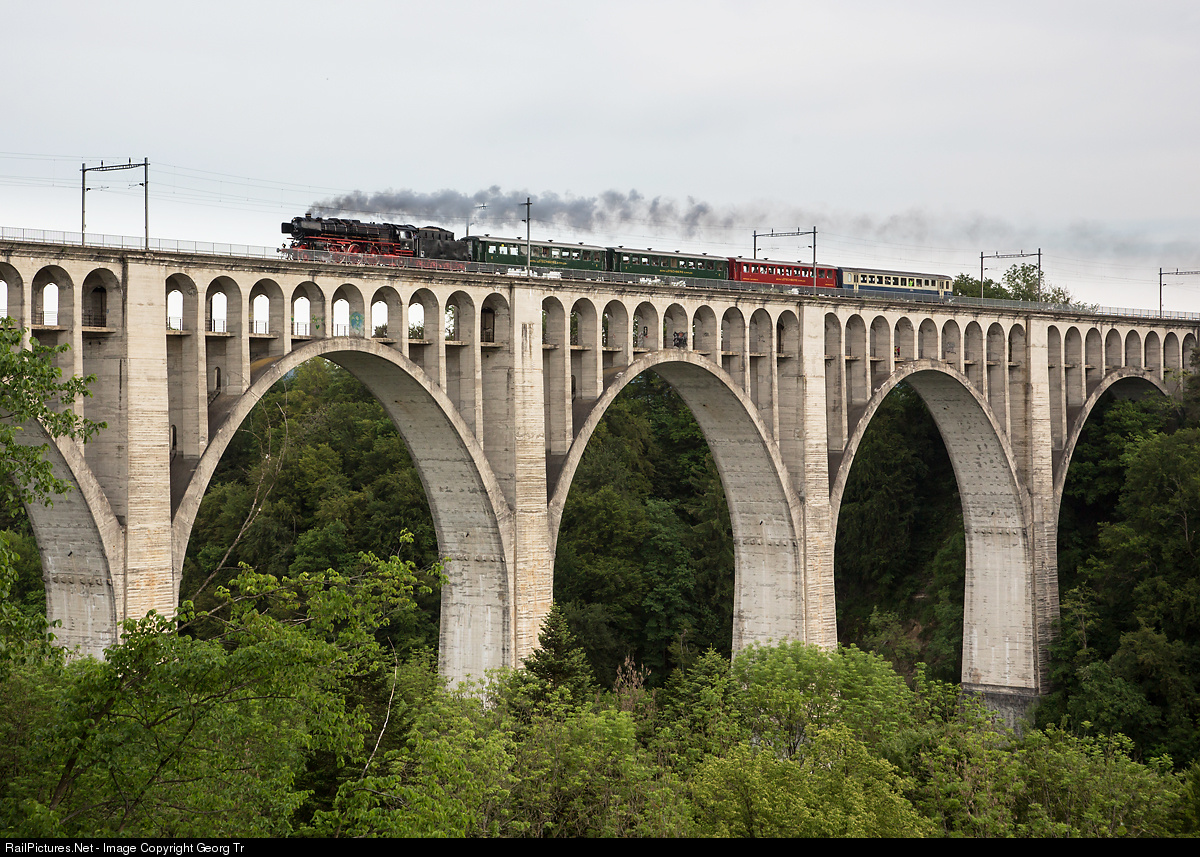 Former Deutsche Bundesbahn express train steamlocomotive 01 202 (Pacific 4-6-2) is crossing the 352 meter long and 82 meter high Grandfey viaduct near Fribourg, which is bridging the river Sarine with seven 42 meter wide bows. The train is going from Lyss via Berne-Lausanne to Vevey on the occasion of the paddlesteamer parade 2014.