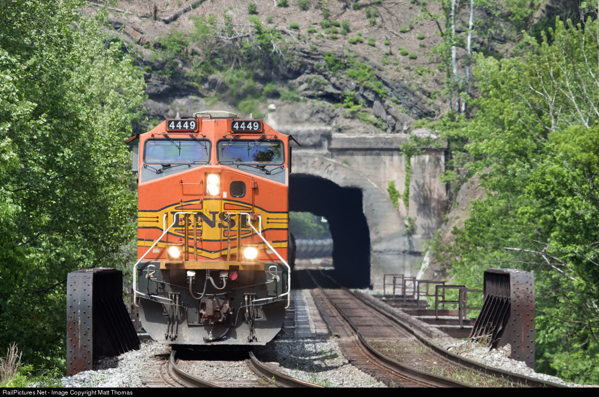 Exiting Graham Tunnel and Kessler Bridge two BNSF loco's lead a buffer car and almost a mile long string of empty tank cars westbound back to the oil fields. This train actually covers two states where is sits. The head end is in WV, the middle (in Graham Tunnel) is in MD and the rear end is again in WV. The is the Keystone Pipeline in wheels.