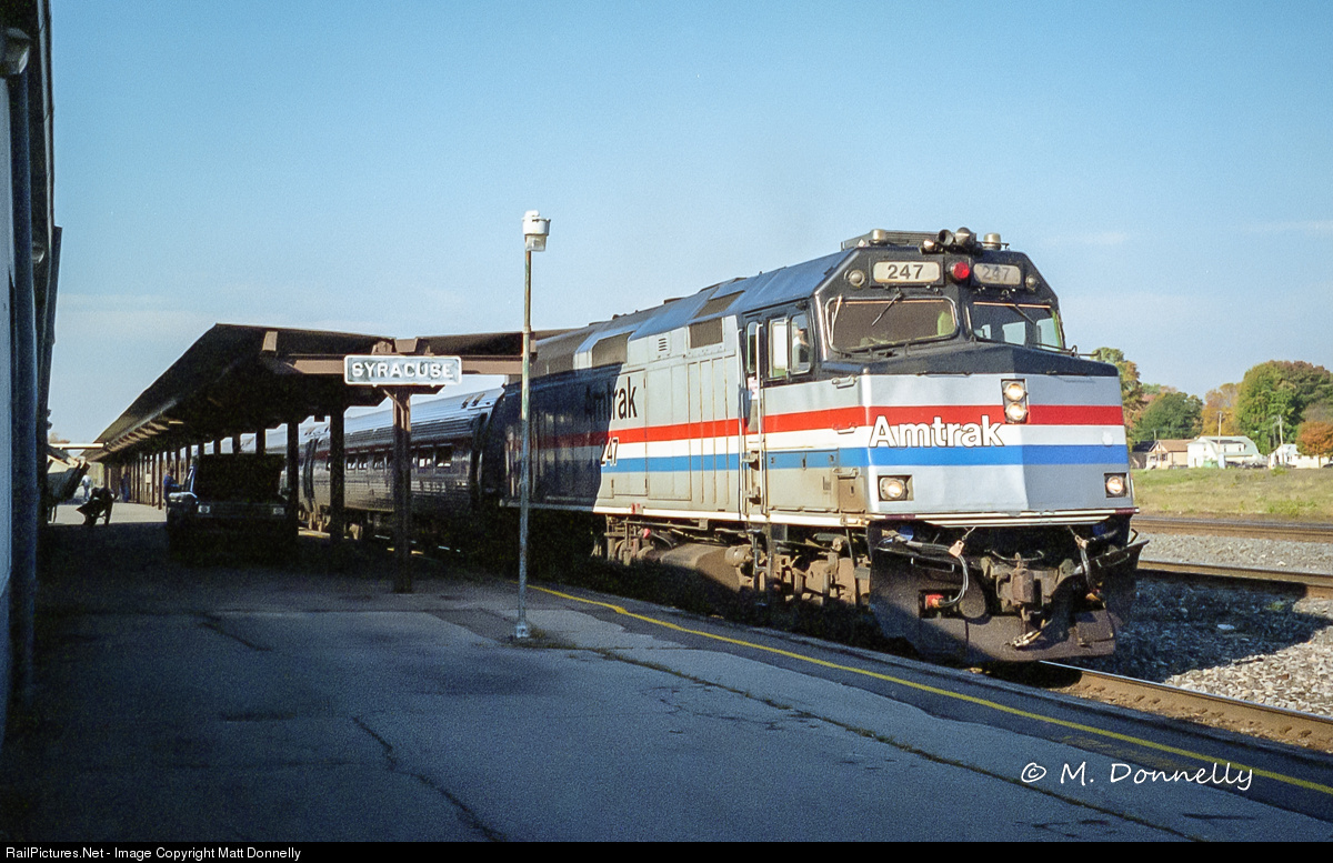 | The 247 leads an eastbound Empire Service train out of Syracuse. This is likely the Empire State Express. Note the Genesis style nose logo and pin stripes along the anti climber. |