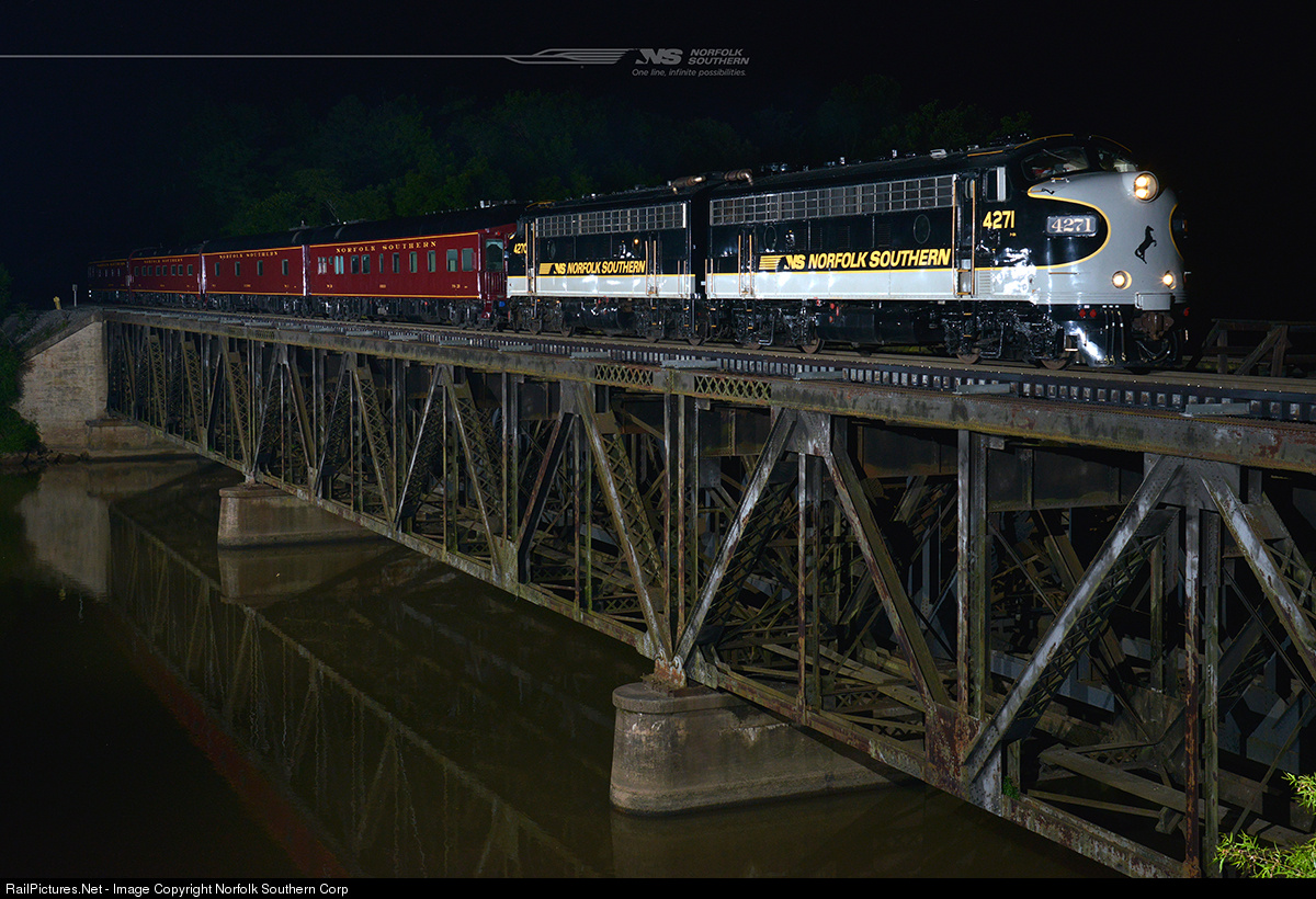 Norfolk Southern's F9-A units (4271 and 4270) leads a 4 car office car special across the Yadkin River in Spencer, North Carolina. In just a few miles, the train would arrive at the North Carolina Transportation Museum to participate in the "Streamliners at Spencer" event. Photo by Casey Thomason. For more information about Norfolk Southern, visit www.nscorp.com