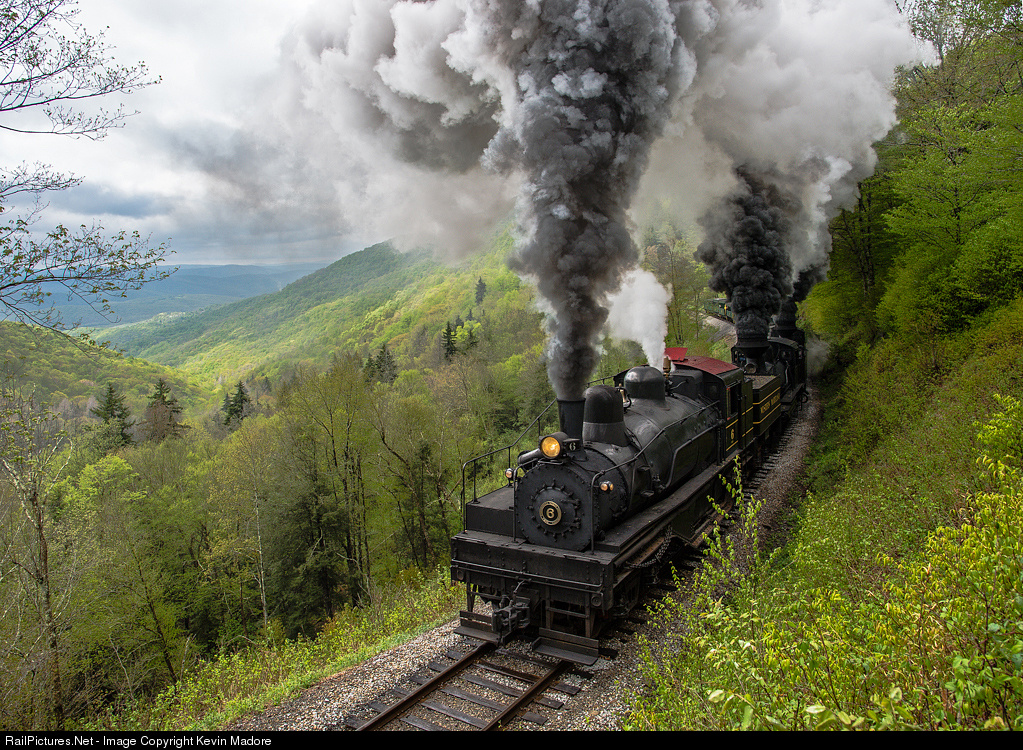 Hammering up Cass Hill. The hulking, 162-ton Western Maryland Shay #6 leads the charge as a Cass triple-header passes the scenic overlook just short of the switches at Old Spruce. This was a typical day on Cass Hill in May. A little sun, a lot of clouds, and just plain cold. Memorial Day was but a week away, and I was wishing my winter coat wasn't still in the closet back home!