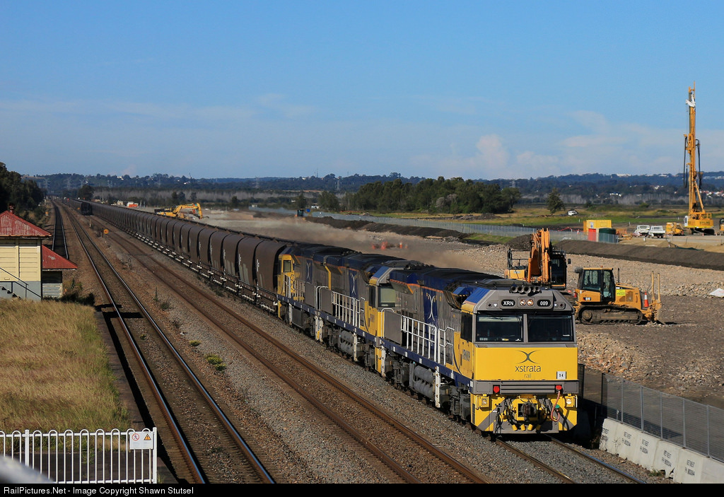 | Xstrata's XRN009 Leads Two Sister Units past Hexham, Newcastle N.S.W and past construction of the New Aurizon maintenance depot for there Hunter Fleet, with a Down Empty Coal Service... |