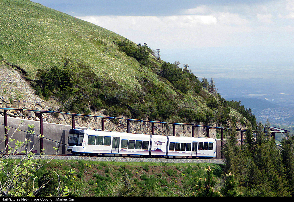 | Cogwheel train near the upper station on the Puy de Dôme (1465 meters over sea level) near Clermont-Ferrand (right in the background). The line is 5.3 km long. Over the track is a coverage for stones and snow |