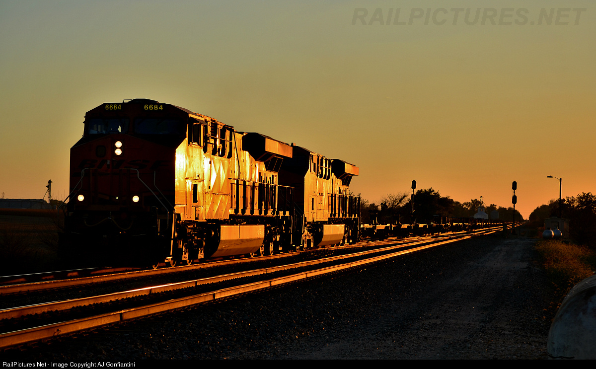 | BNSF 6684 leads an eastbound baretable train over the BNSF Ottumwa sub on the last rays of light, creating a glint effect. |