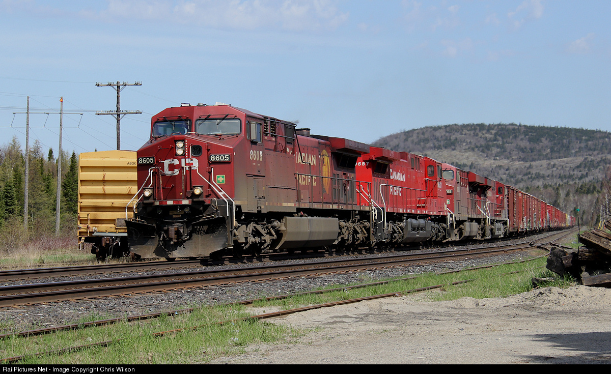 | CP 8605, 9657, 8768, 8779 pull a long and heavy 420 through Marathon with a good 50+ loads of pulp from the three remaining Northwestern Ontario pulp mills. AV Terrace Bay in Terrace Bay ; Resolute Forest Products in Thunder Bay ; and Domtar in Dryden! |