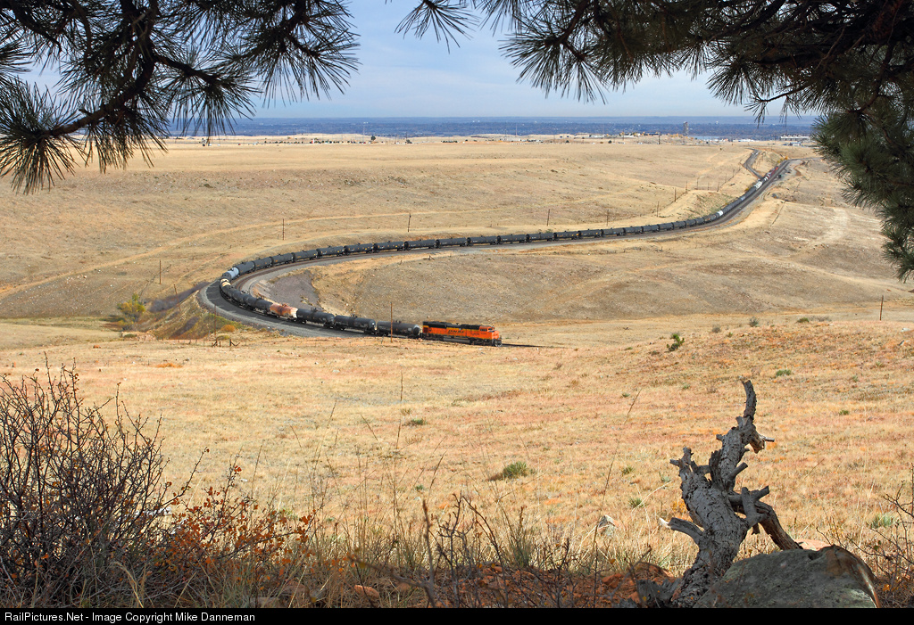 BNSF’s M-PVODEN (Provo, Utah to Denver manifest) curves around Little 10 Curve at Rocky, Colorado, on October 20, 2012. The head end power is passing the switch for Rocky Spur in the distance, while lone DPU EMD SD70ACe No. 9384 holds back the rear of the train.