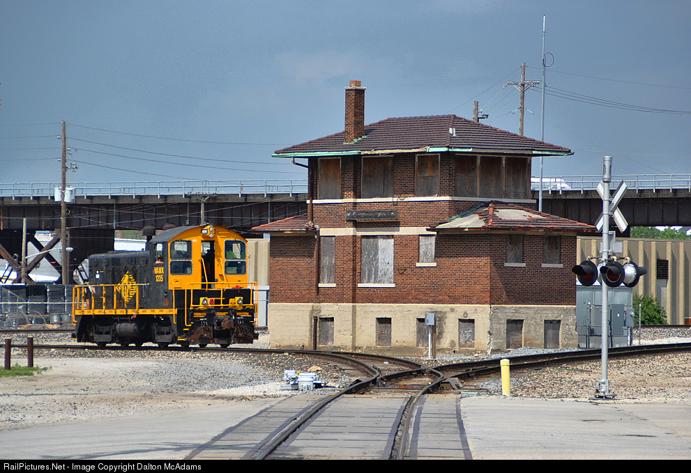 | Bound for UP's Armourdale Yard, a KCT SW1200 passes through the Adams Street Interlocker, and the boarded-up tower that stands guard near by. |