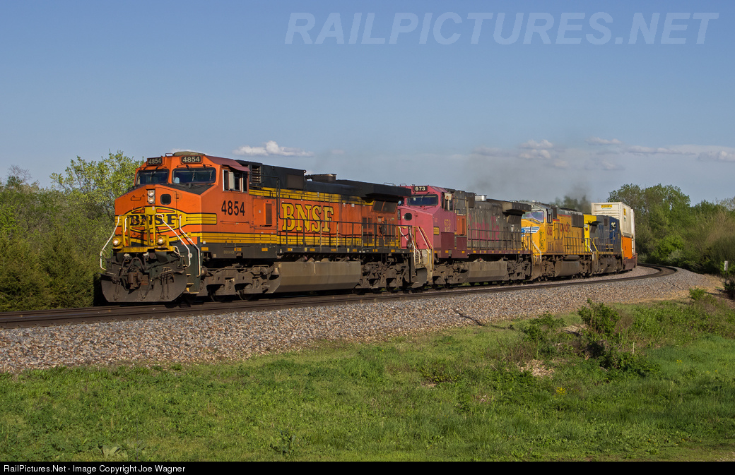 A very colorful consist hustles Chicago, IL to Stockton, CA doublestack train Q-CHISTO around Houlihan's Curve on the BNSF's Chillicothe Subdivision. Two BNSF Dash 9's, one still in Warbonnet paint, a UP SD70M, and a CSXT C40-8W make up this rainbow like consist.