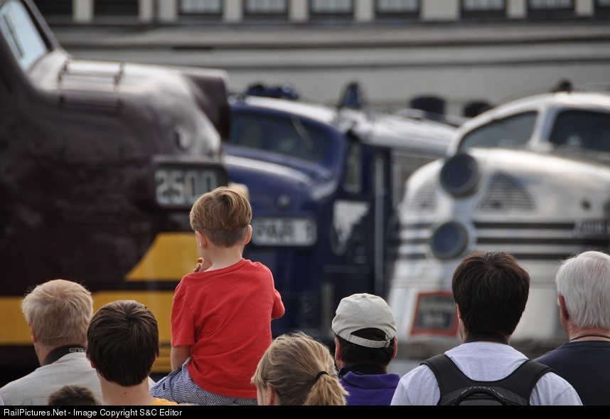 "Lift me up, Daddy!" A young railfan gets a boost while trying to view historic locomotives at the Streamliners at Spencer event.