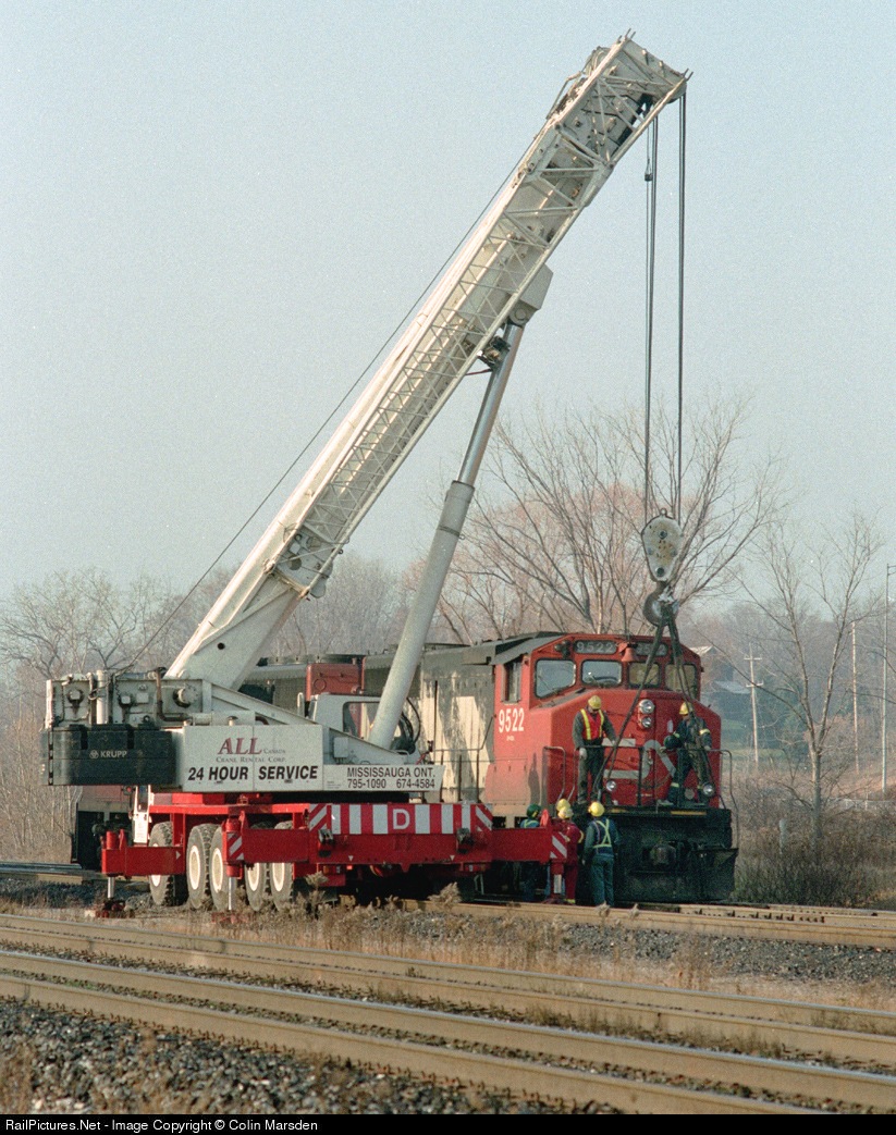 CN9522 and CN9421 became derailed as they entered Aldershot yard during the early morning of 4 December 1998. A local road crane was called in to assist in recovery.
