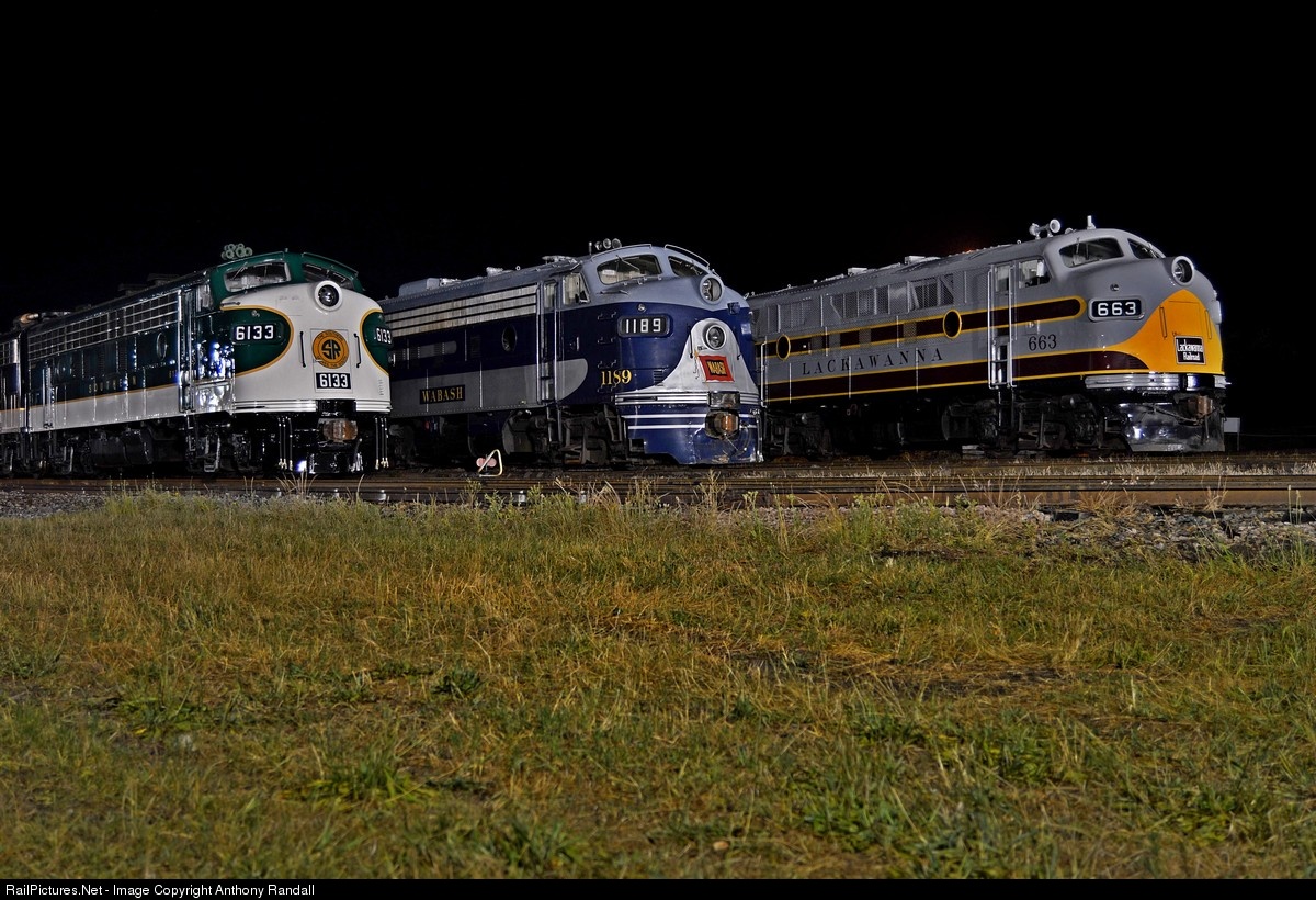 | The first night photo shoot at Spencer finds the Museum's own Southern FP7 No. 6133 spotted alongside Wabash F7 No. 1189 of the Monticello Railway Museum and the Lackawanna-painted F3 No. 663 of the Anthracite Railroads Historical Society on the south end of the museum grounds. |
