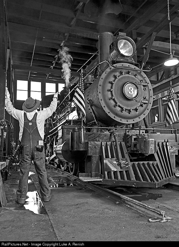 | After a long day of running, Sierra Railway 4-6-0 #3 is slowly walked into it's stall in the 1897 wooden roundhouse. |