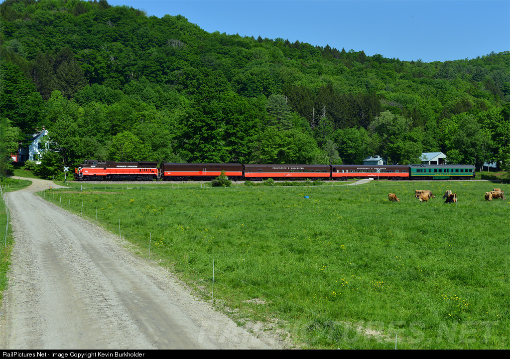 | On June 3, the Vermont Rail System, New England Central and Providence & Worcester Railroad operated a Green Mountain Gateway inspection trip with P&W B40-8W 4006 leading the office car special. The full train is seen rolling through rural Baileys Mills, Vermont as a field of cows barely takes notice. |