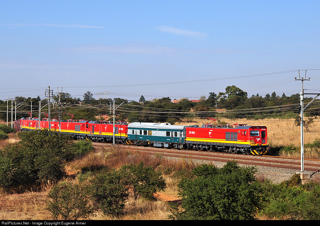 On 19th & 20th May, five of the first ten Class 20E dual voltage 3kV DC / 25kV AC electric locomotives, built in China by Zhuzhou Electric Locomotive Co., a subsidiary of the China South Locomotive and Rolling Stock Corporation (CSR), worked a test train of 104 type CR ore wagons overnight from Warrenton to the Arcelor Mittal steelworks in Vanderbijlpark. The return working with 104 empties ran in daylight and is seen here making its way from Bijlcor yard towards the junction at Houtheuwel.