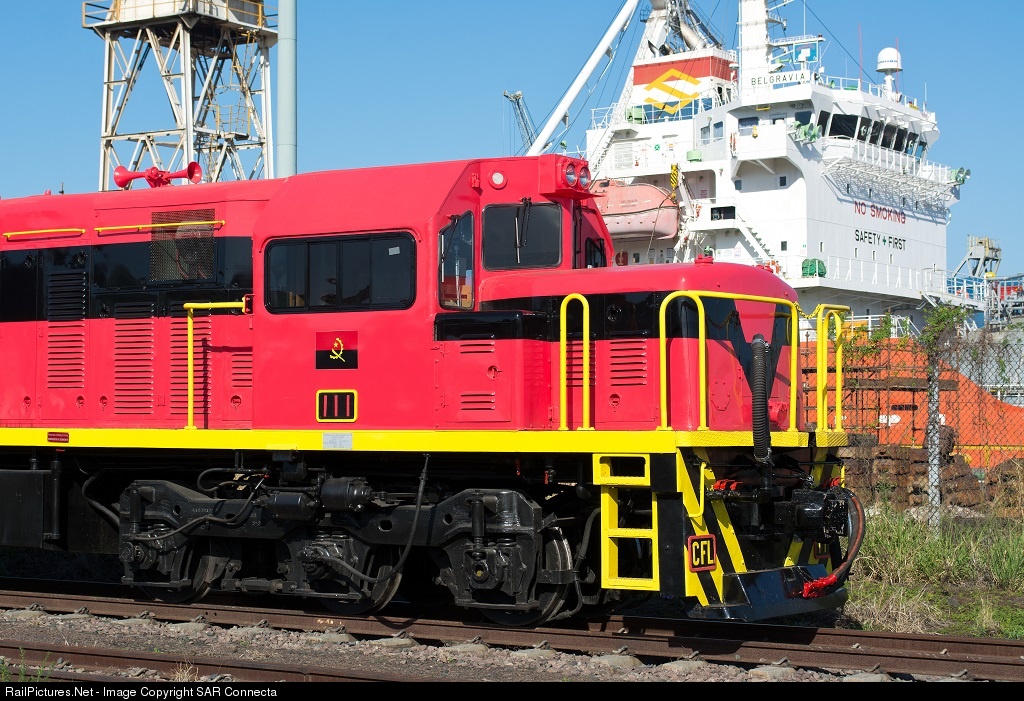 The national flag of Angola has been incorporated prominently in the new livery of CFL (Caminho de Ferro de Luanda) / Luanda Railway - sometimes called Angola Railway. CFL 111 (GE U20C) is pictured here in a holding yard alongside the dry dock (MV Belgravia in the dry dock) at Maydon Wharf, Durban, awaiting the arrival of a ship to take her and CFL 104 back to Angola. Both locomotives have been fully refurbished in South Africa to a very high standard by Pretoria based company, African Rail & Traction Services.