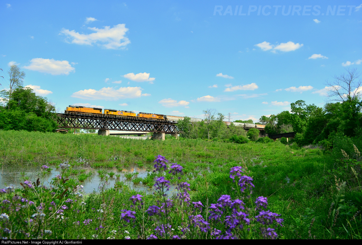 UP 4542, 8306, and 7863 are shoving a loaded grain train over the Rock River that they just brought up from the bridge on the bottom right, down to the UP yard to be taken to Proviso and points beyond.