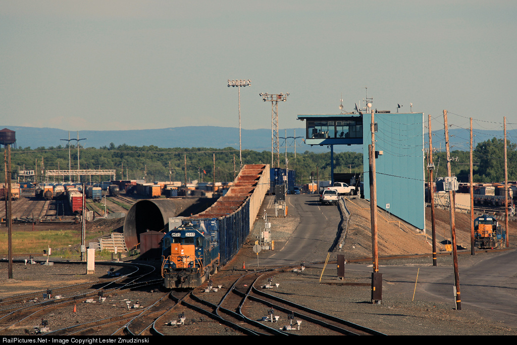 A wide look at Selkirk's hump and tower, as empty construction debris gons head up.