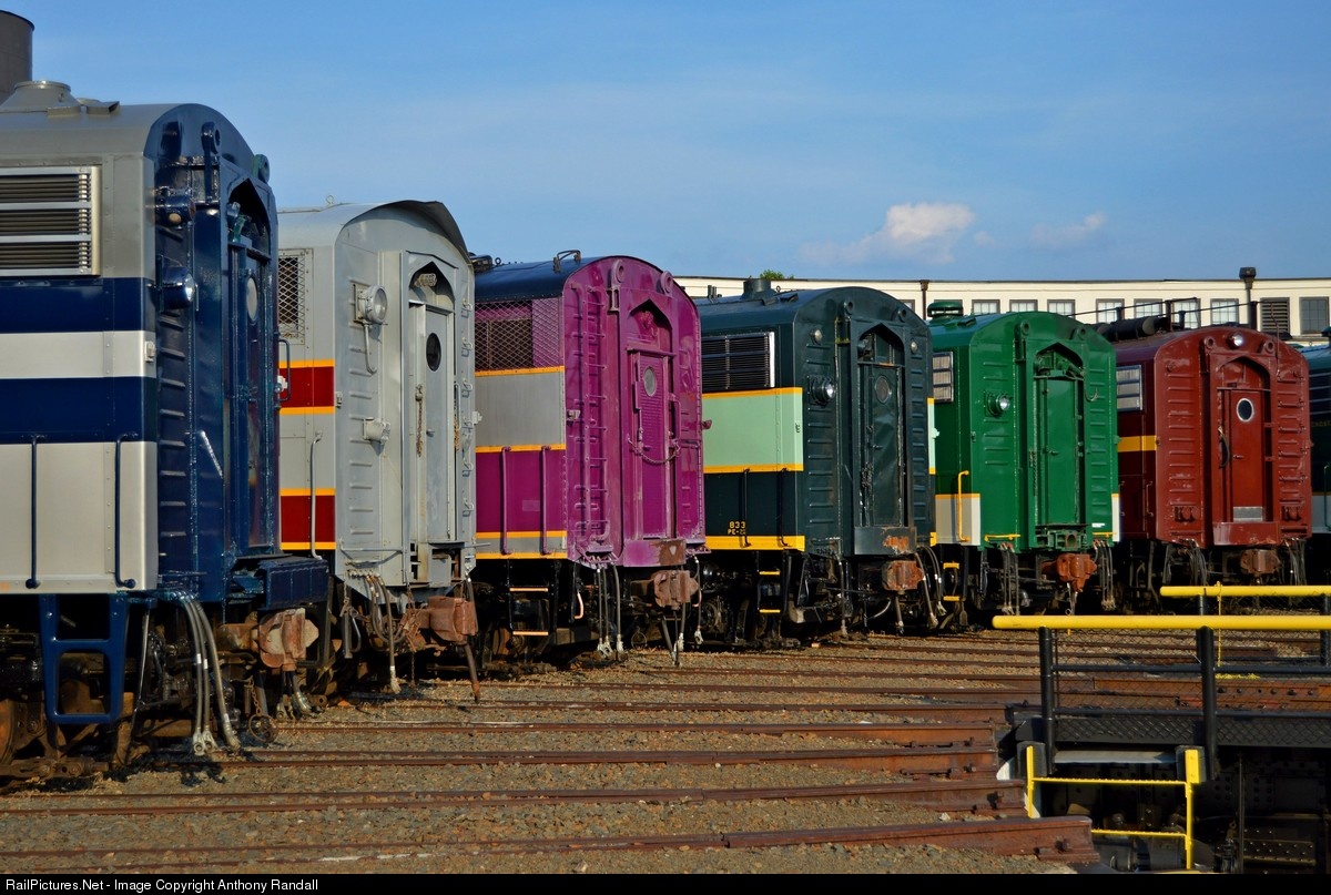 E and F units of various schemes wait patiently, their backs to the stage, for the barrage of railfan photographers the following day. Pictured from left to right are Wabash E8 1009, DL&W-painted F3 664, ACL E3 501, Erie E8 833, SOU E8 6900, PRR E8 5711, and SOU FP7 6133.