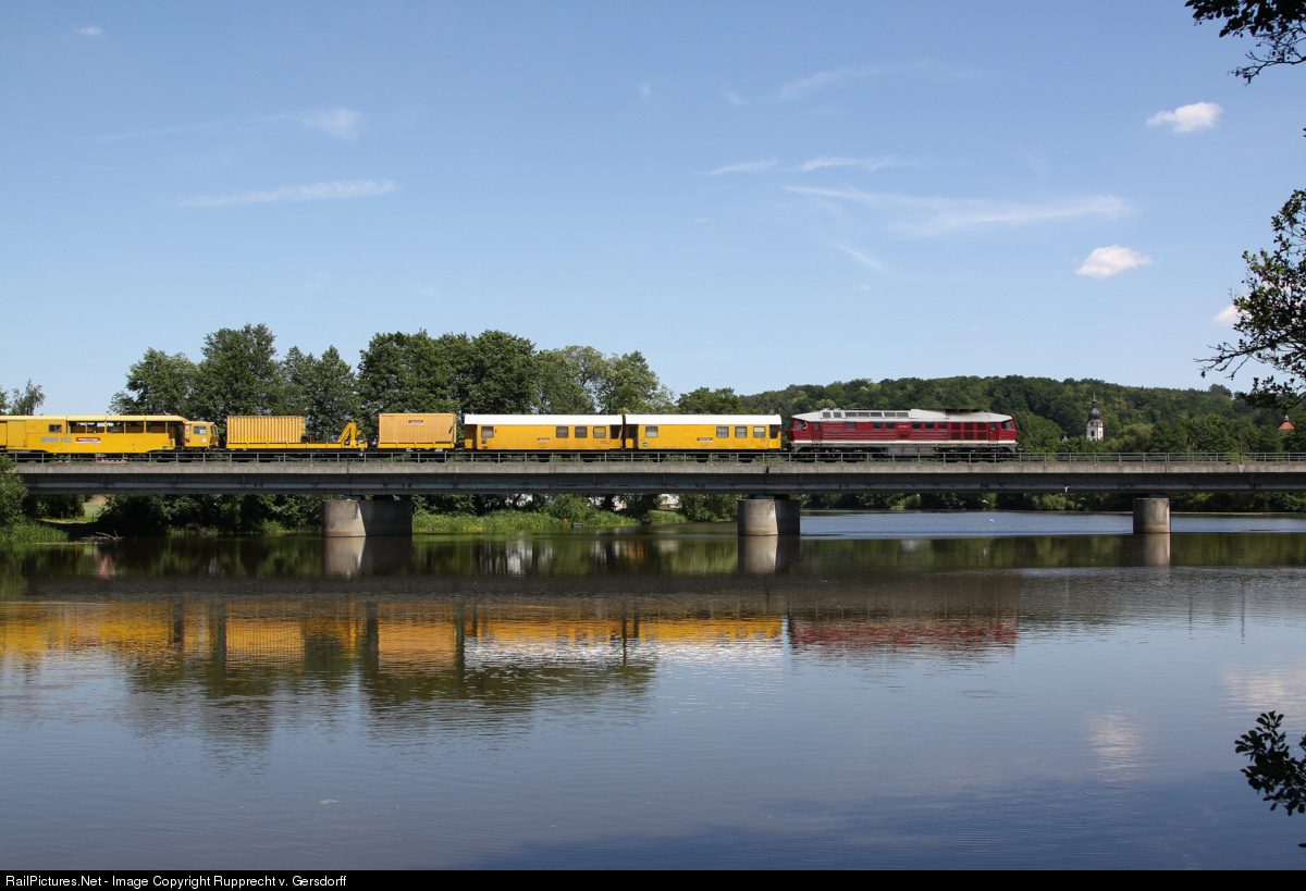 "Ludmilla" 232 550, still in old DR livery, crosses the river Naab with a MOW-train