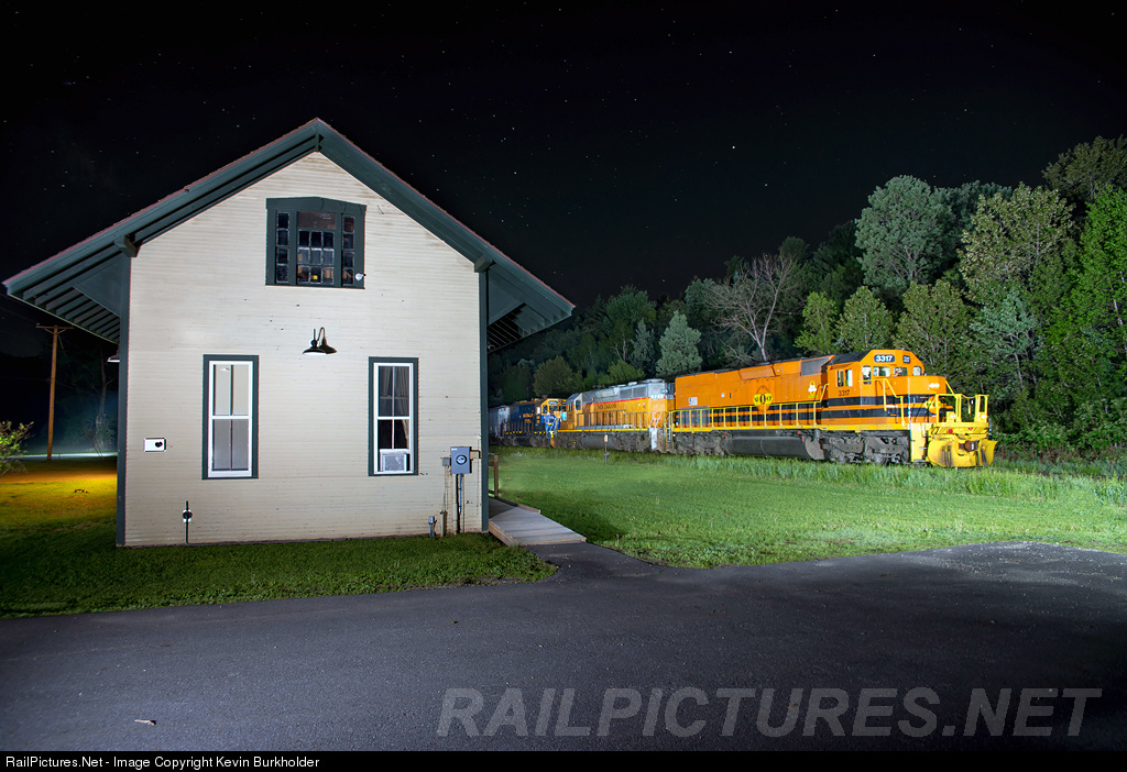 | At the crest of the summit on the Roxbury Subdivision, the old Roxbury station still stands in this village of around a dozen houses as the NECR 323 passes at 02:00 on June 8. The 323 was led by each of the NECR paint schemes (sans RailAmerica) in reverse order of existence - the NECR SD40T-2 3317 (GWI orange), NECR SD40-2 721 (in ex-FEC/UP yellow grey), and NECR GP38 3850. An in-camera double exposure and the use of 6 AlienBees B1600 lights. |