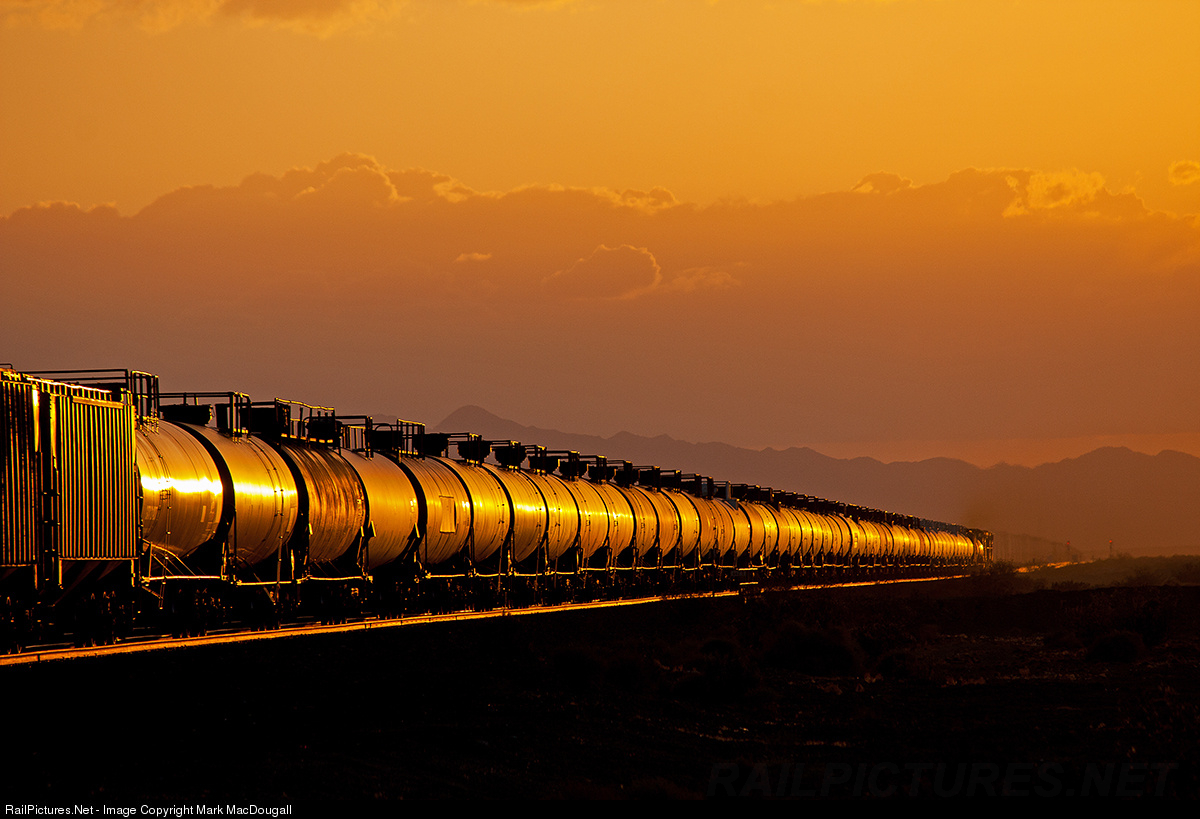 The sunset shines off of tank cars in the desert.