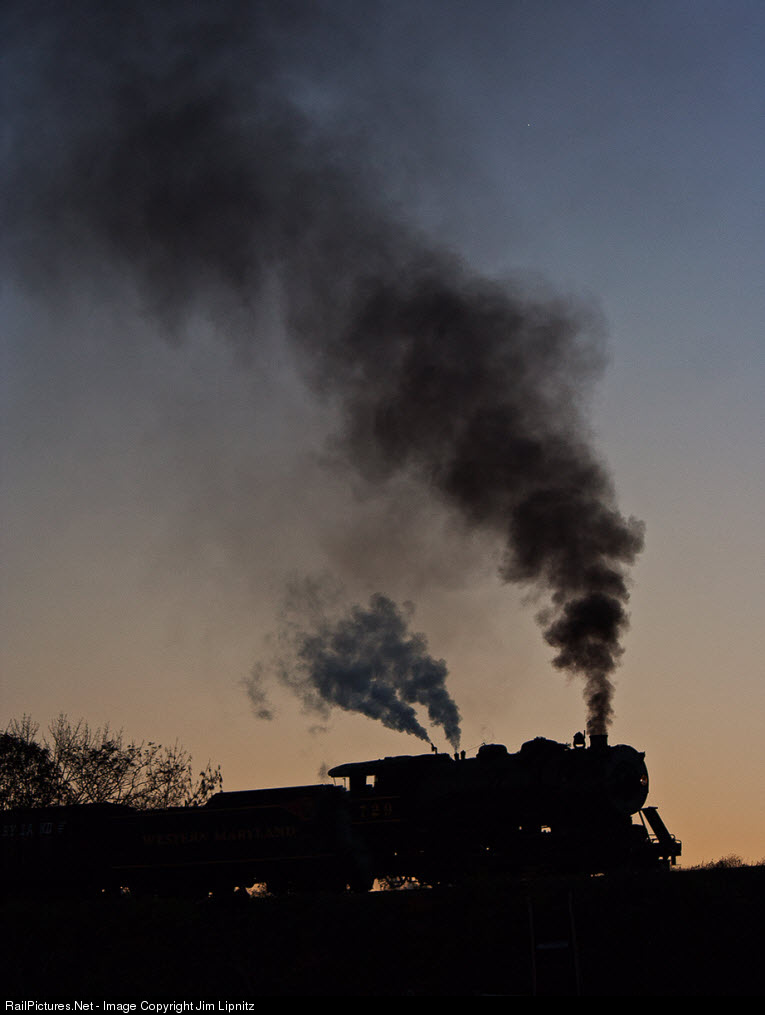 Western Maryland 2-8-0 #729 leads a freight train around Helmstetter's Cuve as the sun is setting behind the engine. A plume of smoke and the engine is silhouetted by the remaining light of day.
