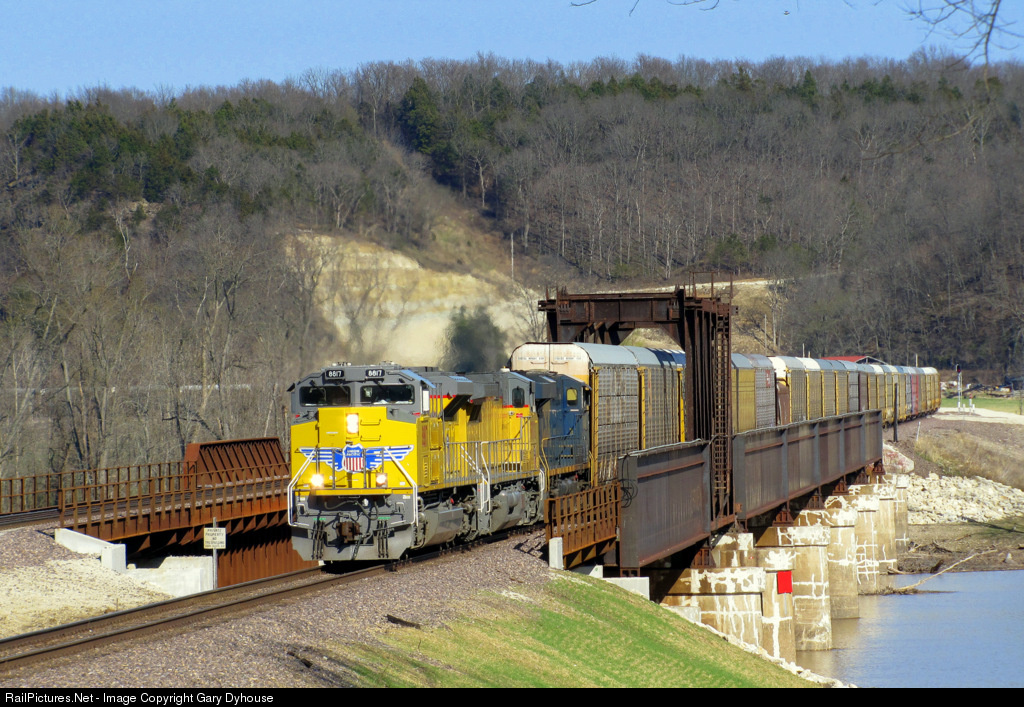 Interesting power leads UP autorack train AASAM across the Osage River. The new bridge is to the left of the train.