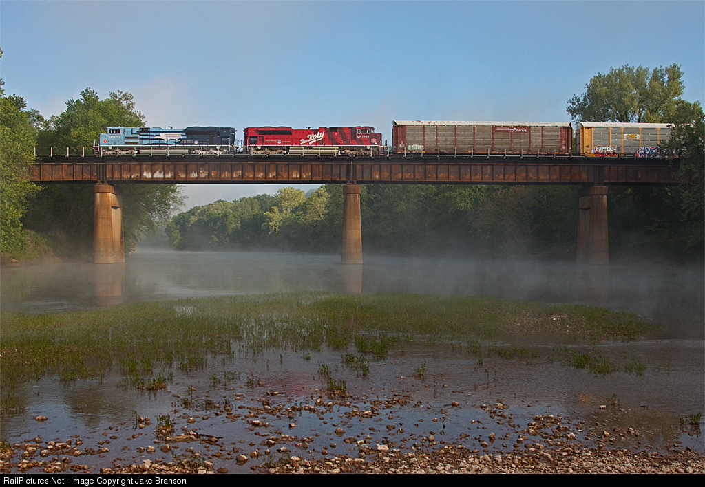 | Early in the morning of May 17, UP's Mopac and Katy heritage units are at the helm of AASFX 17 as they scream across a foggy Meramec River in western St. Louis County. |